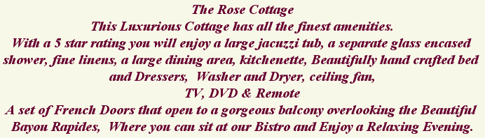 The Rose Cottage This Luxurious Cottage has all the finest amenities. With a 5 star rating you will enjoy a large jacuzzi tub, a separate glass encased shower, fine linens, a large dining area, kitchenette, Beautifully hand crafted bed and Dressers, Washer and Dryer, ceiling fan, TV, DVD & Remote A set of French Doors that open to a gorgeous balcony overlooking the Beautiful Bayou Rapides, Where you can sit at our Bistro and Enjoy a Relaxing Evening.
